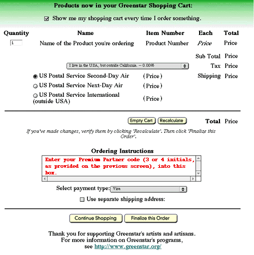 ![]() your Premium Partner code Greenstar automatically tracks your purchase, so that your Premium Partner can receive an 8% commission to support its work. To make this happen, please enter the Premium Partner code you see on the previous Web page into the "Ordering Instructions" box on the first order screen you see. This screen will appear right after you click the "Order" or "Download" button to select the product you want. Part way down the screen, below your order details, is the "Ordering Instructions" box. When you're finished with the other details on this screen, click the "Finalize Order" button at the bottom of the screen, or the "Continue Shopping" button to see other items in the Greenstar solar-powered ecommerce store. |